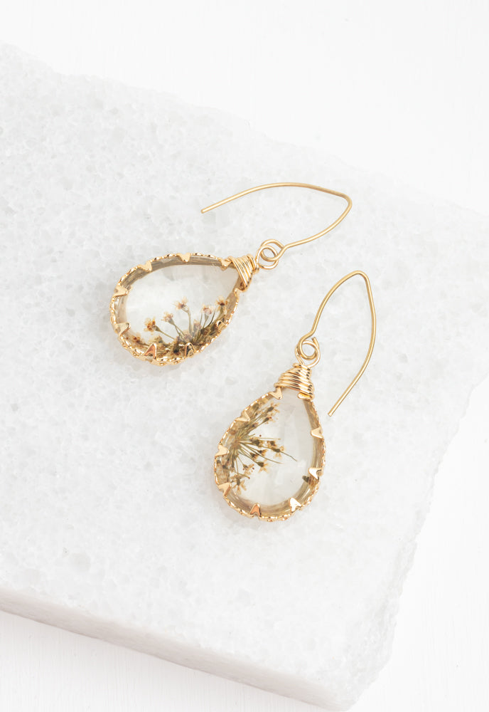 Our Blossom Earrings are teardrop-shaped prong settings that hold delicate dried flowers wrapped in shimmering glass. Each delicate flower reminds us of every woman’s unique story of restoration while the teardrop shape reminds us of the nourishing rain before the bloom. With its timeless modest 14K plated gold hook, the Blossom Earrings are perfect for everyday wear. Thank you for restoring hope with us through your purchase of the Blossom Earrings.