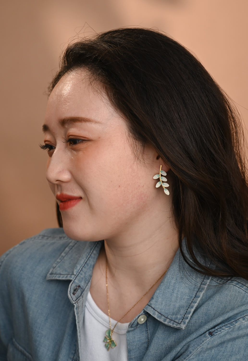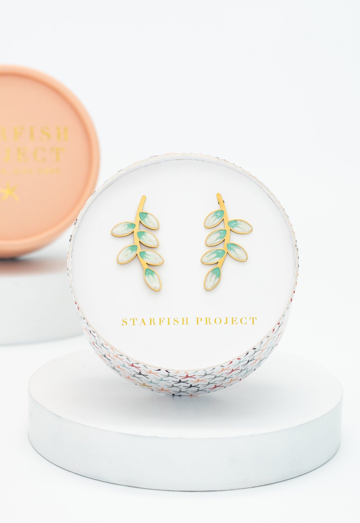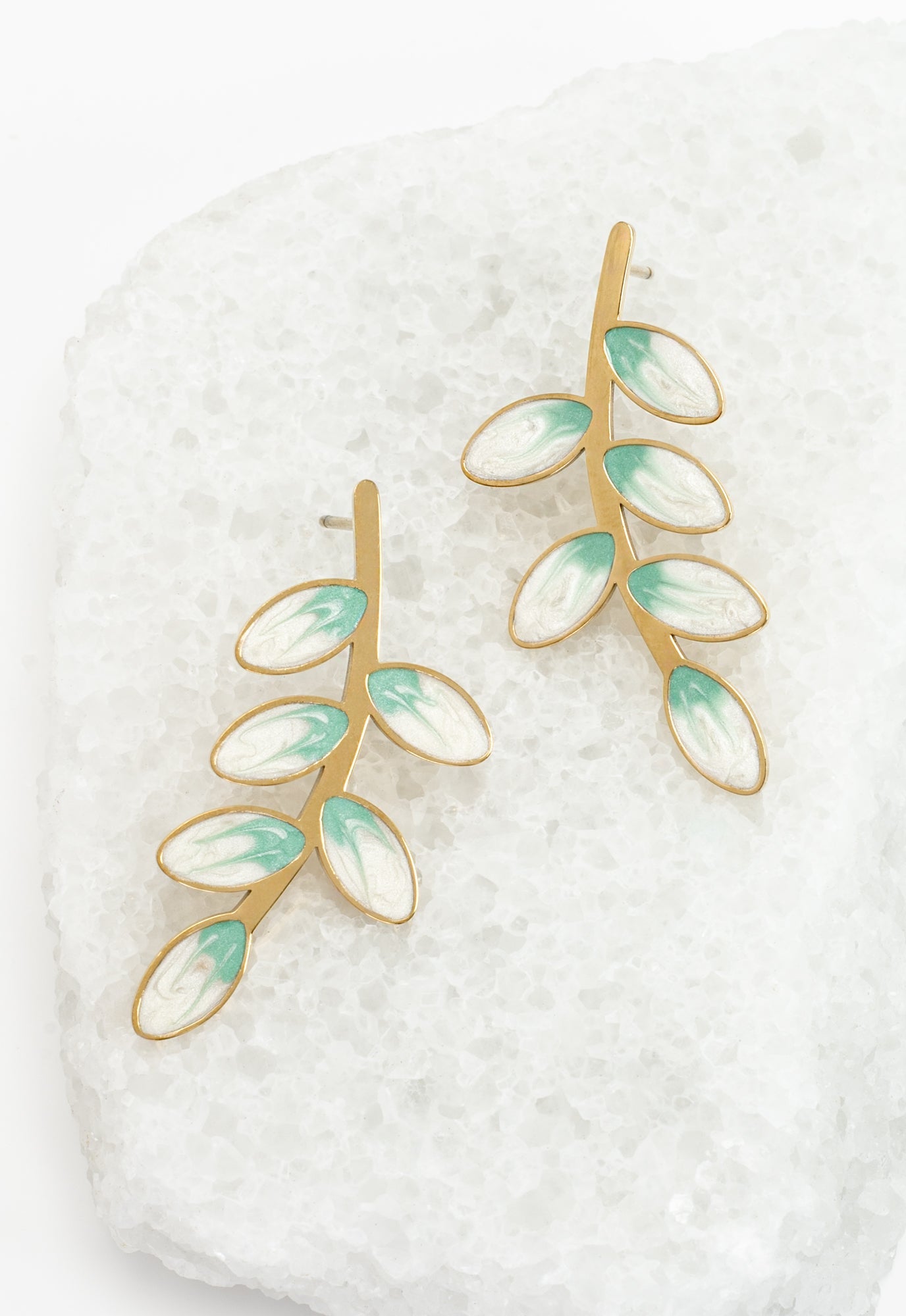 Our Hope Grows Earrings are crafted in 14K plated gold and painted with layers of mint and ivory enamel, forming a graceful, cascading leaf design. When you buy, wear and gift the Hope Grows Earrings join a story of freedom, hope, and brighter futures for survivors. Style them with soft curls, or gift them as a symbol of growth and resilience.