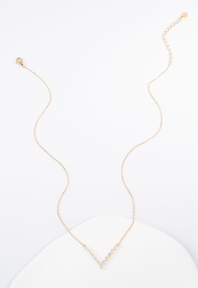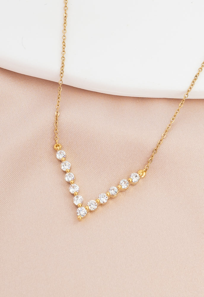 Embody elegance with our Brilliance V-Bar Chevron Necklace, a dazzling fusion of 14K plated gold and shimmering zircon stones in a delicate chevron setting. It exudes sophistication and style! Wear it solo for a touch of understated glamour, or layer with other pieces for a personalized look. Elevate any formal look from your big day to a night out with its radiant sparkle and timeless charm.